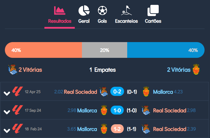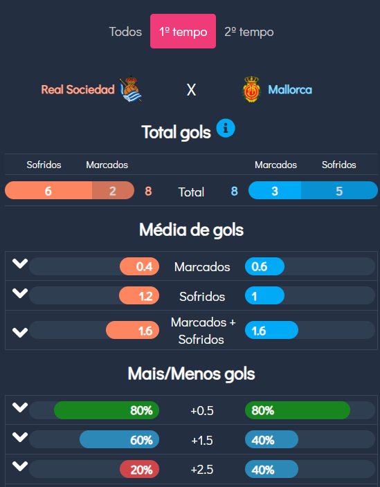 - Vulnerabilidade Defensiva: A Real Sociedad sofreu uma média de 1.2 gols por primeiro tempo em seus jogos, enquanto o Mallorca sofreu 1.0. Esses números demonstram que ambas as defesas têm sido vazadas com frequência no início das partidas, aumentando a probabilidade de um gol cedo.