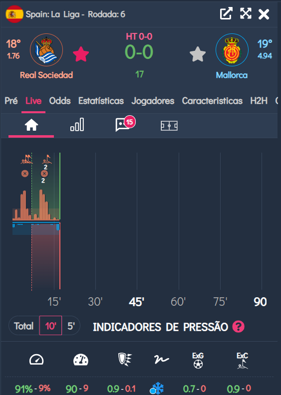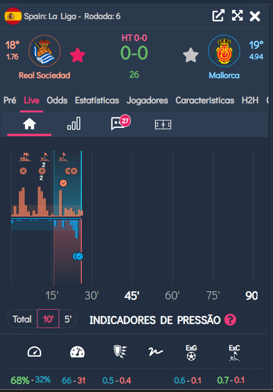 O gráfico de pressão da imagem acima aponta pressão do mandante. Real Sociedade não permite contra ataques neste momento, mas Mallorca mostra que em breve pode encaixar uma resposta.