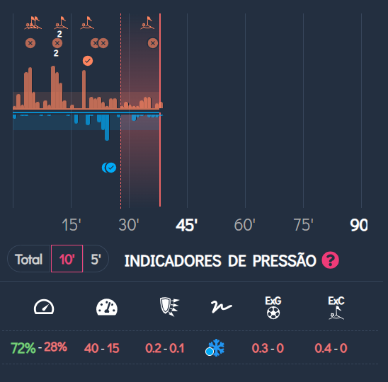 Os indicadores de pressão apontam para um jogo frio no minuto 30 até o minuto 35. isso fica evidente para quem está realmente assistindo a partida, pois temos um mandante tentando pressionar, mas que não consegue mais criar chances claras de gol.